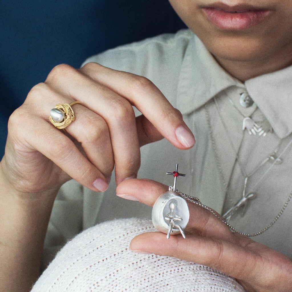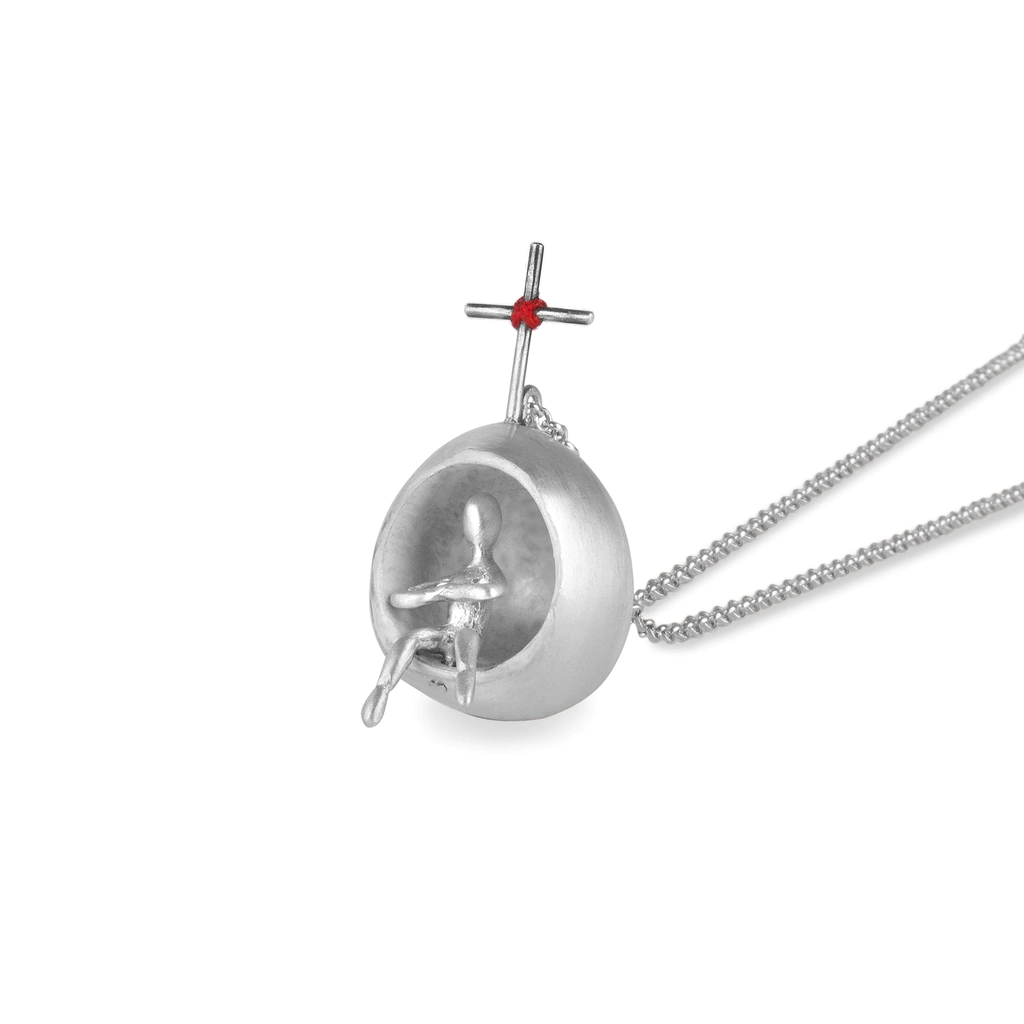 Material: Prata 950 tinta acrílica branca, detalhe oxidado e linha vermelha.